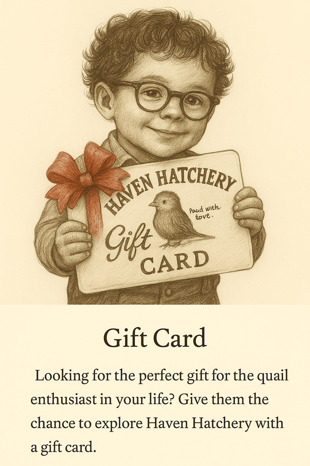 Categories: All Heirloom & Rare Hatching Eggs Day-Old Hatchlings Week-Old Hatchlings Breeder's Blessings Farm Tools & Hatching Gear Quail-Inspired Keepsakes All | Heirloom & Rare Hatching Eggs | Day-Old Hatchlings | Week-Old Hatchlings | Breeder's Blessings | Farm Tools & Hatching Gear | Quail-Inspired Keepsakes | Assorted Coturnix Quail Week-Old Chicks from $2.00 Sold Out Celadon Coturnix Quail Week-Old Chicks from $2.50 Sold Out Calico Coturnix Quail Breeding Set (Copy) (Copy) Sale Price: $32.00 Original Price: $40.00 Sale Dark & Stormy Coturnix Quail Breeding Set (Copy) Sale Price: $32.00 Original Price: $40.00 Sale American Pansy Coturnix Quail Breeding Set Sale Price: $32.00 Original Price: $40.00 Sold Out Black Banded Coturnix Quail Breeding Set Sale Price: $32.00 Original Price: $40.00 Sale Jumbo Pansy Coturnix Quail Breeding Set Sale Price: $32.00 Original Price: $40.00 Sold Out EB (Tibetan and Rosetta) Coturnix Quail Breeding Set Sale Price: $25.00 Original Price: $35.00 Sold Out Black Coturnix Quail Breeding Set Sale Price: $32.00 Original Price: $40.00 Sale Fawn (Italian and Manchurian) Coturnix Quail Breeding Set Sale Price: $25.00 Original Price: $35.00 Sold Out Ginger Coturnix Quail Breeding Set Sale Price: $32.00 Original Price: $40.00 Sold Out Breeder's Choice Coturnix Quail Breeding Set Sale Price: $20.00 Original Price: $35.00 Sold Out Inkveil Collection - Tibetan Tuxedo Coturnix $11.99 Sold Out Featherlight Grace – Handcrafted Quail Feather Earrings Sale Price: $6.99 Original Price: $10.00 Sold Out Celadon Coturnix Quail Breeding Set Sale Price: $32.00 Original Price: $40.00 Sold Out Jumbo Mix Collection Coturnix Quail Eggs for Hatching from $11.99 Sold Out Cottonbright Collection - Snow-White Jumbo Coturnix from $11.99 Sold Out Coturnix Quail Eggs for Eating from $6.00 Sold Out Bluegrass Blues Celadons - Celadon Coturnix from $11.99 Sold Out Celadon Coturnix Quail Chicks from $1.50 Sold Out Assorted Varieties Mixed Eggs for Hatching from $12.00 Sold Out Haven Exclusive Mystery Mix Coturnix from $10.99 Sold Out Assorted Coturnix Quail Chicks from $1.00 Sold Out Farm & Feather Gift Card – Haven Hatchery from $25.00 Haven Hatchery Quail Egg Cutter Scissors Sale Price: $3.00 Original Price: $5.00 Sold Out
